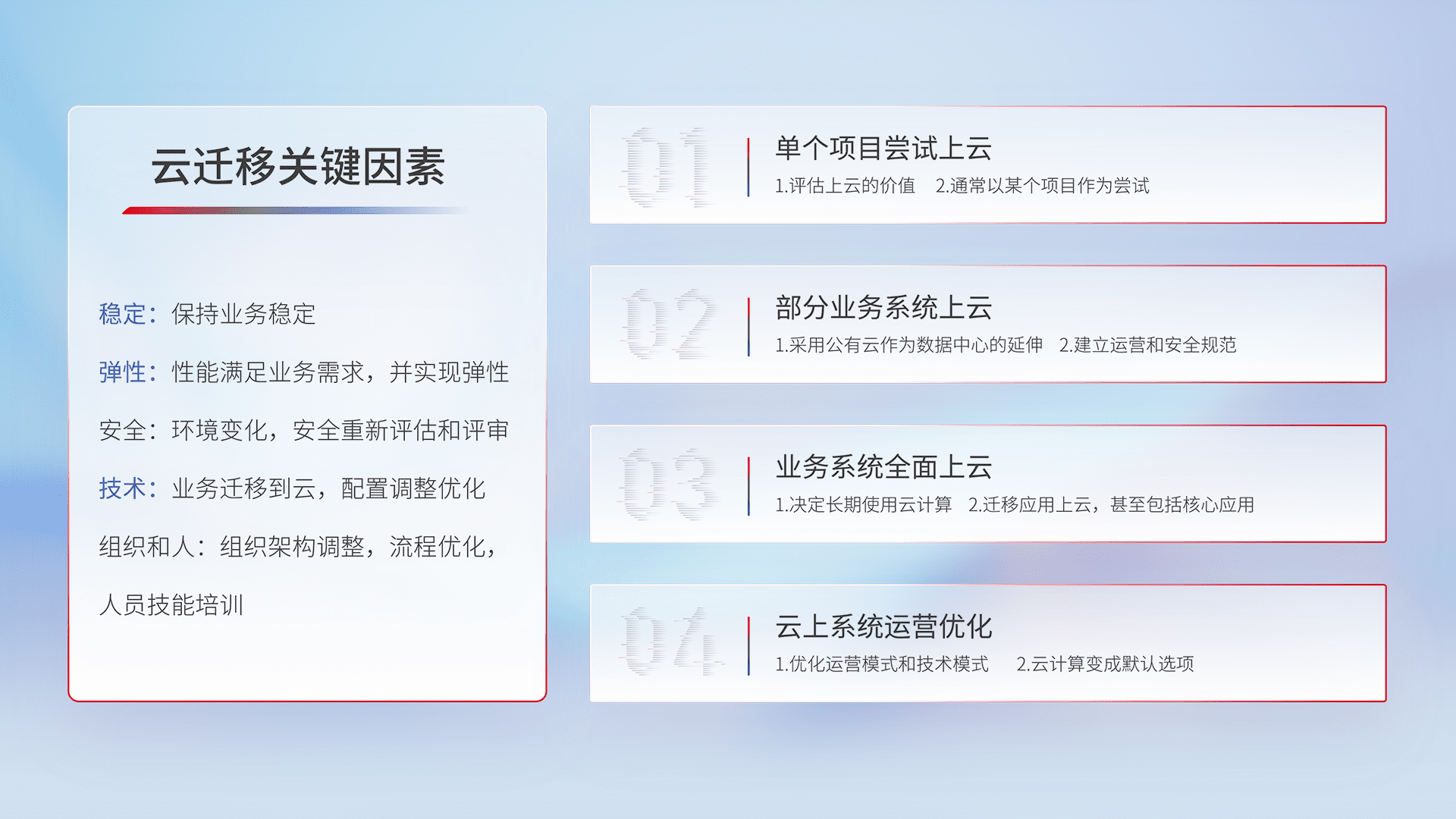 结合实际业务,,从规划设计、、、、云平台选型、、、、云原生改造、、、、数据迁移、、、、集成交付,,迁移全过程为客户识别最佳上云路径,,,,做好风险识别管理,,设计网络架构、、、、身份权限、、、安全审计合规、、、、操作审计、、、、日志审计、、监控告警策略、、、、多站点容灾设计等,,对云上基础设施进行整体规划,,提升IT治理水平,,,,以满足弹性、、高可用、、、高性能的需求。。。。